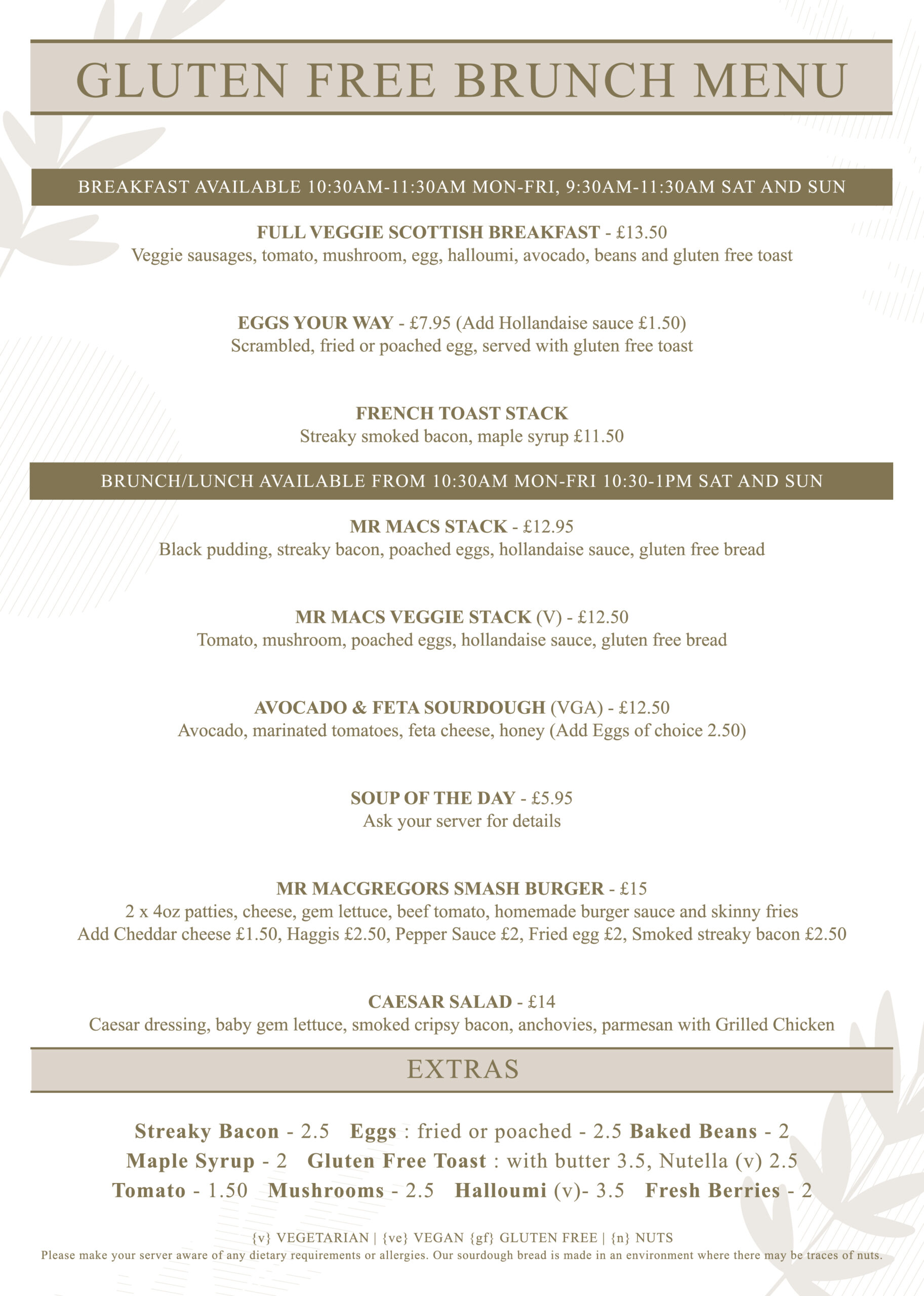 Gluten Free and Vegetarian Breakfast and Brunch menus are also available